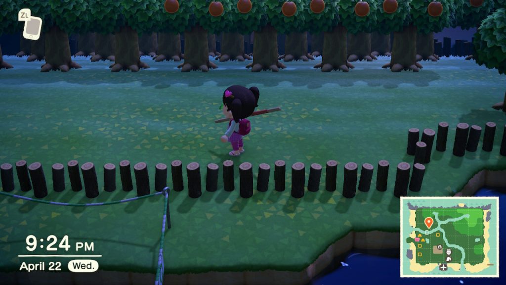 Mr. Nook asked me to set up a bridge. i found the perfect spot. Right next to where i set up the orchard for all the fruit trees i found on the island.